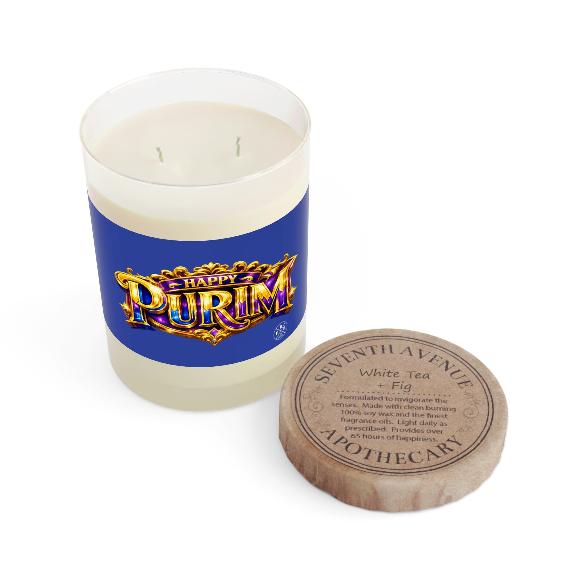 Light this candle and let celebration fill the room. This full-glass 11 oz soy candle carries a rich, festive label that reads “Happy Purim,” set in jewel-toned lettering with gold accents. The double-cotton wicks give an even, relaxing glow while the clean-burning soy wax releases layers of whichever scent you choose — White Tea & Fig for gentle sweetness, Lavender & Sage for herbal calm, or Ocean Mist & Moss for a fresh, grounding breeze. The glass jar’s vivid 360° print adds a decorative touch to a mantel, seder table, or entry shelf, and the recyclable lid keeps the scent sealed between uses. Burn time around 65 hours makes it long-lasting for a season of gatherings and remembrance.